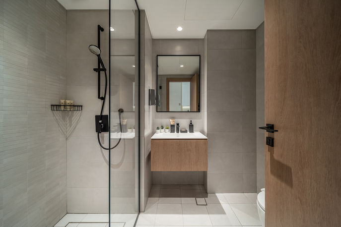 The spacious built-in wardrobe, complete with automatic lighting, provides ample storage, while the modern walk-in shower with black-finish fixtures adds a touch of elegance. A full-length wall-mounted mirror lets you check your look before heading out.