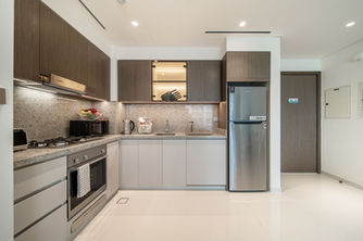The bedroom offers a peaceful retreat with a king-sized bed dressed in premium linens and plush pillows. A spacious built-in wardrobe keeps your space tidy and organized. Just steps away, the modern bathroom features a walk-in shower and comes with a complimentary welcome kit, including shampoo, body gel, and lotion for a hotel-like touch.