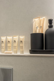 The apartment features both a full bathroom with a walk-in shower and a convenient powder room, stocked with a luxurious welcome pack including shampoo, conditioner, lotion, and fresh towels.