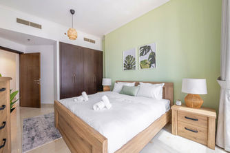The second bedroom has a fresh, tropical feel with a light green wall and rattan touches. Another king-sized bed promises a good night’s sleep, and there’s a wooden chest of drawers with a mirror plus plenty of wardrobe space. It’s bright, breezy, and perfect for guests or kids.