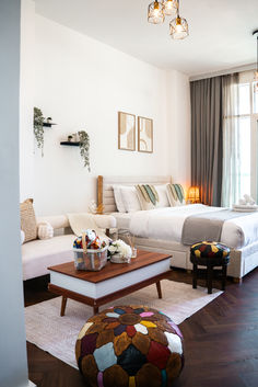 The sleeping area features a queen-sized bed dressed in fresh white linens and plump pillows. The wood-accented frame and rattan bedside lamp add a touch of warmth, while the abstract artwork and modern ceiling light bring a contemporary feel. There’s a built-in wardrobe for your belongings and a full-length mirror tucked neatly in the corner.