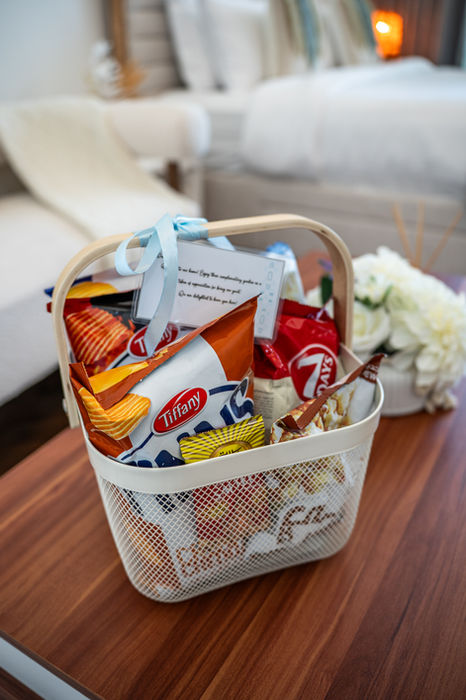 The living area has a clean, modern feel with a white sofa, wooden coffee table, and a soft rug underfoot — perfect for curling up with a book or watching your favourite series on the 65” Smart TV.