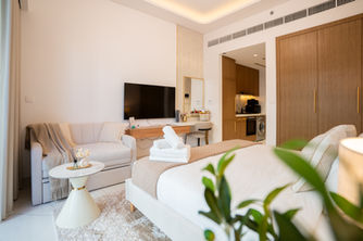 Welcome to this cozy and stylish studio—an ideal home base for a relaxing stay. The comfortable double bed is dressed with soft linens and plush pillows and is perfectly positioned facing a Smart HD TV, making it easy to unwind with your favorite shows. Bedside tables with warm lamps add an extra touch of comfort, while a cozy sofa tucked into the corner provides a perfect spot to relax or read.