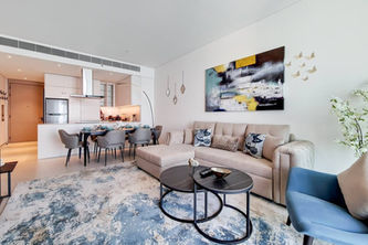 Step into the living area, where soft tones and natural light set a calm, welcoming mood. A beige comfy sofa invites you to relax and easily turns into a bed for extra guests. Sink your feet into the soft carpet, enjoy a coffee on the marble-top table, or unwind in the blue armchair with your favourite show on the HD TV. Large windows wrap around the space, offering lively city views from every angle.