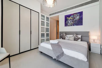 The master bedroom is your private haven. A king-sized bed with premium linens and plush pillows promises restful nights. Soft bedside lamps, a modern ceiling light and a built-in wardrobe add comfort and convenience. The en-suite bathroom comes with a thoughtful welcome pack, including towels, shampoo, dental kit and more.