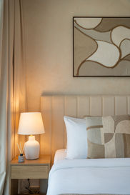 The living room welcomes you with a cosy beige L-shaped sofa and matching armchair, set on a soft carpet that instantly makes you feel at home. Modern ceiling lights let you choose between warm or cool lighting, while a 55-inch Smart HD TV mounted on a wooden accent wall creates the perfect spot for relaxing evenings. A wooden coffee table and stylish artworks complete the space, adding a clean and calming feel.